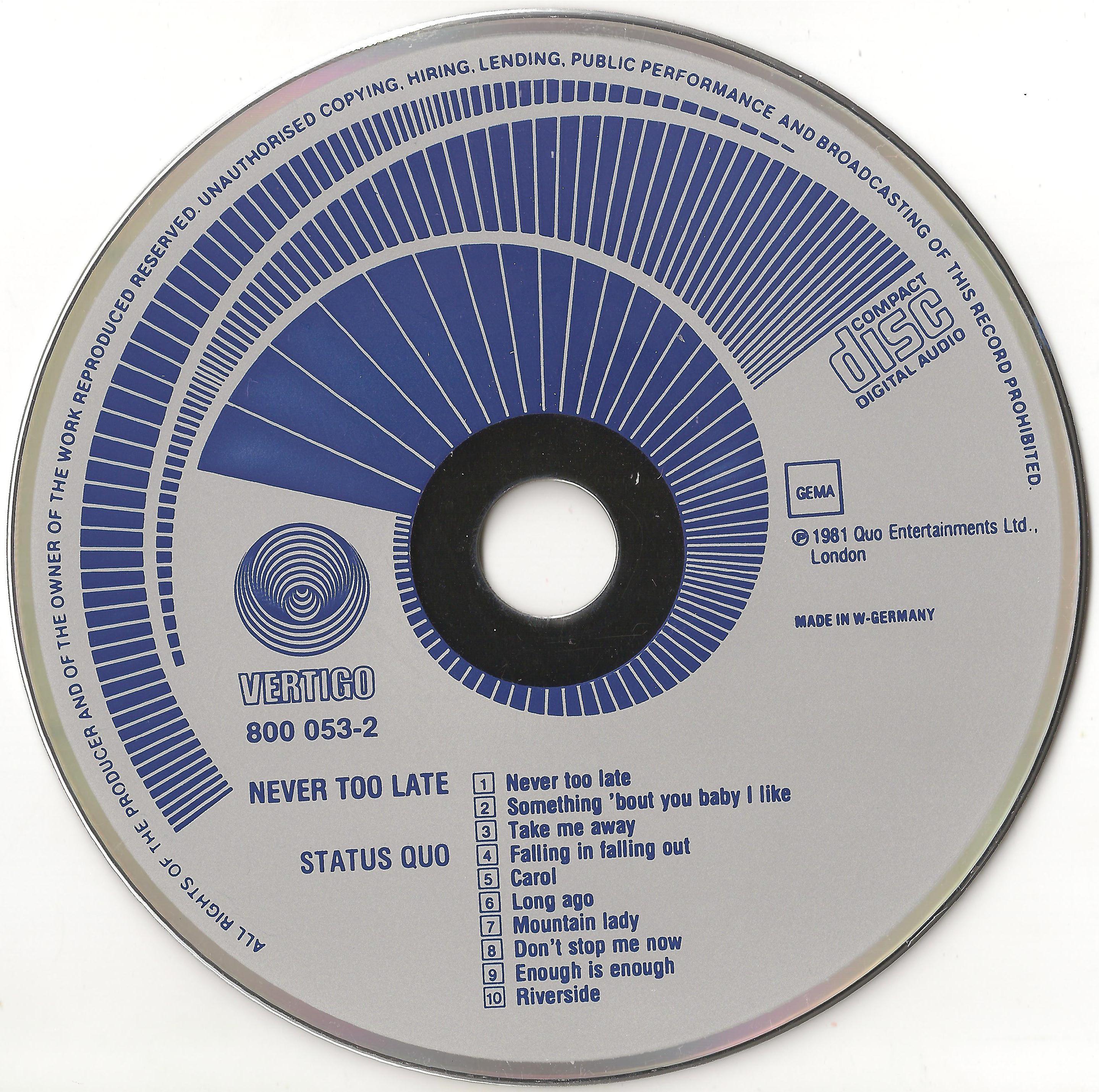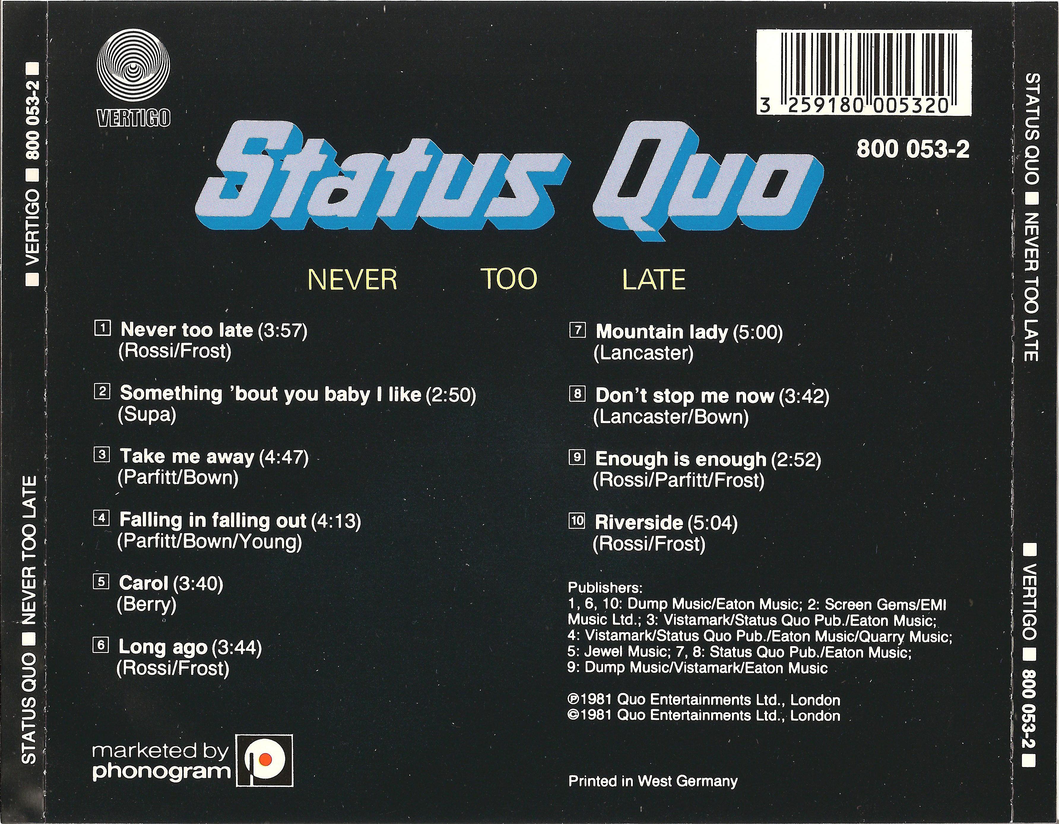 Index of /Max/music/Status Quo -/Status Quo - Albums on CD 1970- 1986 ( Germany, England, & Japan- 1st Press )/Never Too Late, 1981 ( 1983 Original West Germany Press, Vertigo 800 053-2 )/Scans